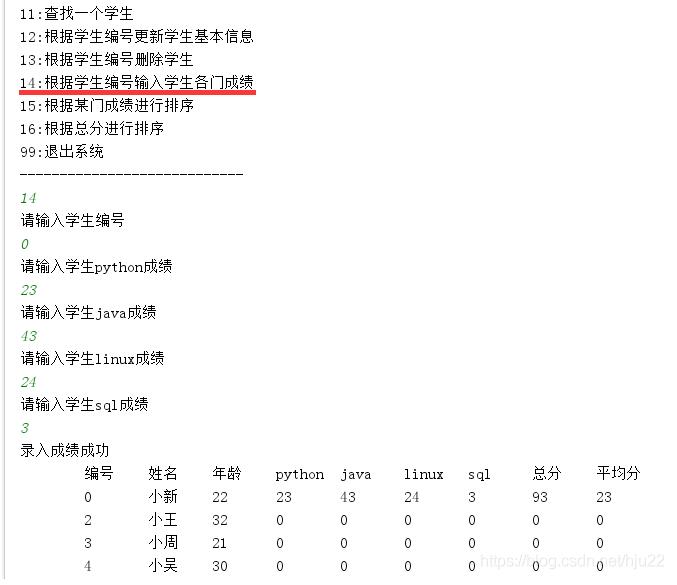 System.out.println("14:根据学生编号输入学生各门成绩");