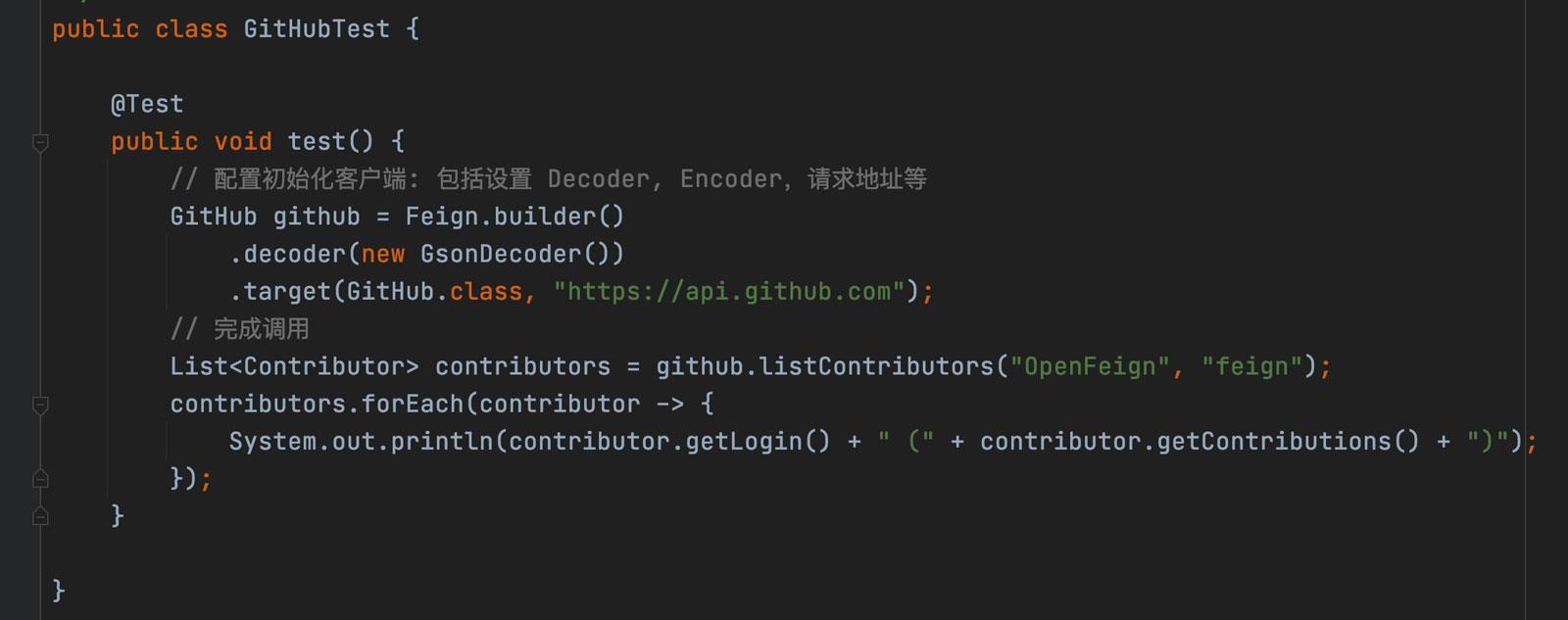 同样还是以获取 Feign 的 GitHub 开源项目的 Contributors 为例,结合 Spring Cloud 的使用方式有如下三步: