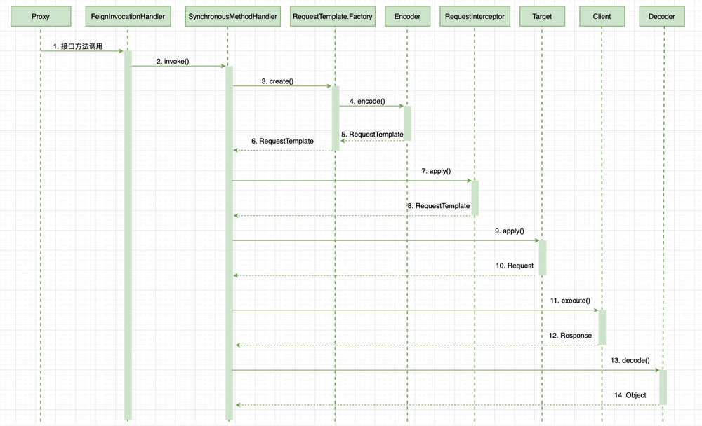 至此,Feign 的核心实现流程介绍完毕,从代码上看 feign.SynchronousMethodHandler 的操作相对比较简单,主要是通过 client 完成请求,对响应进行解码以及异常处理操作,整体流程如下: