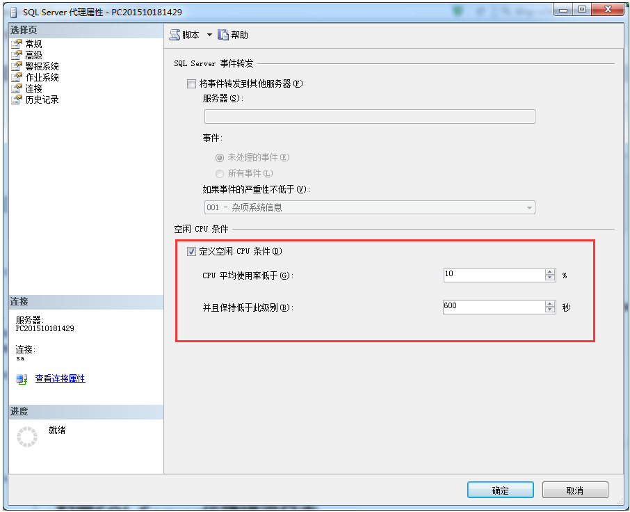 在SSMS配置此选项,右击SQL Server代理,选择属性,然后单击高级选项卡。配置空闲CPU条件 如插图所示