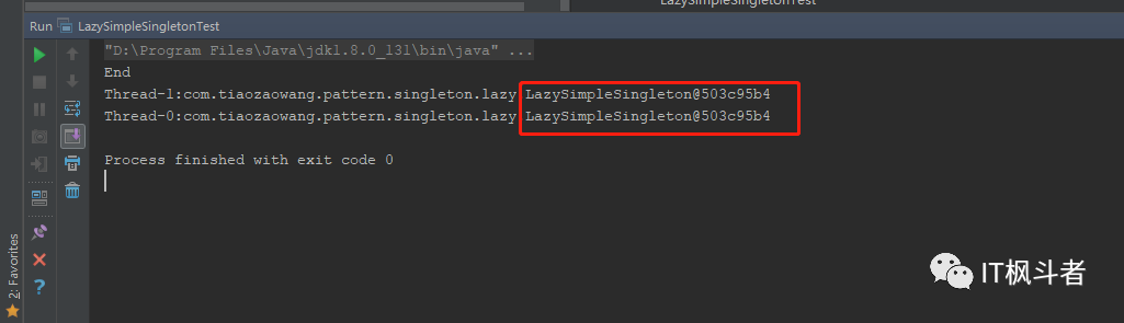 通过不断切换线程,并观测其内存状态,我们发现在线程环境下 LazySimpleSingleton被实例化了两次。有时,我们得到的运行结果可能是相同的两个对象,实际上是被后面执行的线程覆盖了,我们看到了一个假象,线程安全隐患依旧存在。那么,我们如何来优化代码,使得懒汉式单例在线程环境下安全呢?来看下面的代码,给 getInstance()加上 synchronized 关键字,是这个方法变成线程同步方法: