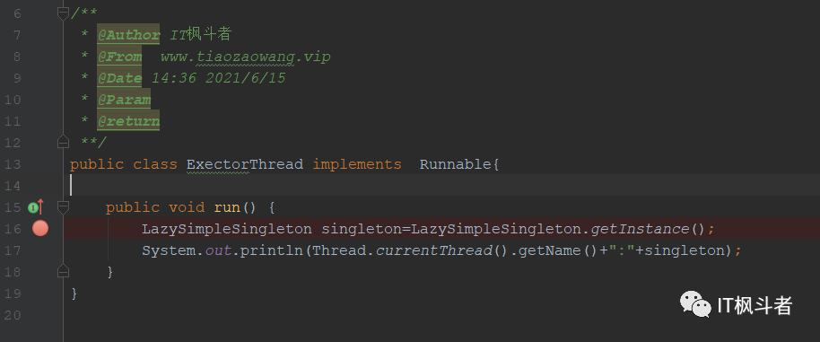 一定几率出现创建两个不同结果的情况,意味着上面的单例存在线程安全隐患。现在我们用调试运行再具体看一下,教给大家一个新技能,用线程模式调试,手动控制线程的执行顺序来跟踪内存的变化状态。先给 ExectorThread 类打上断点: