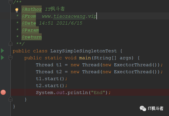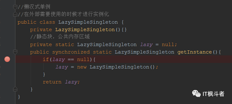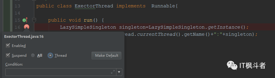 然后,给 LazySimpleSingleton 类打上断点,同样标记为 Thread 模式: