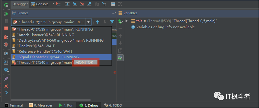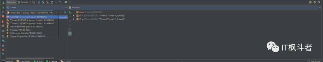 开始 debug 之后,会看到 debug 控制台可以自由切换 Thread 的运行状态:
