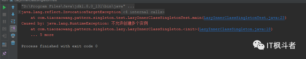 大家有没有发现,上面介绍的单例模式的构造方法除了加上 private 以外,没有做任何处理。如果我们使用反射来调用其构造方法,然后,再调用 getInstance()方法,应该就会两个不同的实例。现在来看一段测试代码,以 LazyInnerClassSingleton 为例: