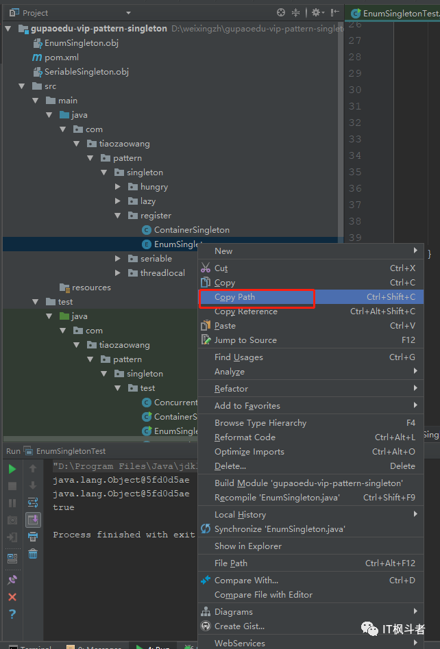 没有做任何处理,我们发现运行结果和我们预期的一样。那么枚举式单例如此神奇,的神秘之处在哪里体现呢?下面我们通过分析源码来揭开它的神秘面纱。下载一个非常好用的 Java 反编译工具 Jad(下载地址:https://varaneckas.com/jad/),解压后配置好环境变量(这里不做详细介绍),就可以使用命令行调用了。找到工程所在的 class 目录,复制 EnumSingleton.class 所在的路径,如下图: