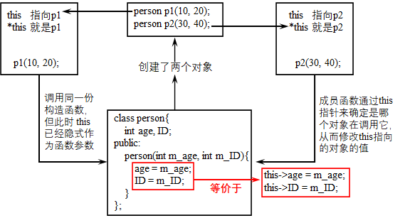 接着上一小节的问题,this指针为上述问题提供了一个完美的解决方案,它指向用来调用成员函数的对象(被当作参数隐式地传递给成员函数),我们通过一张图来理解它: