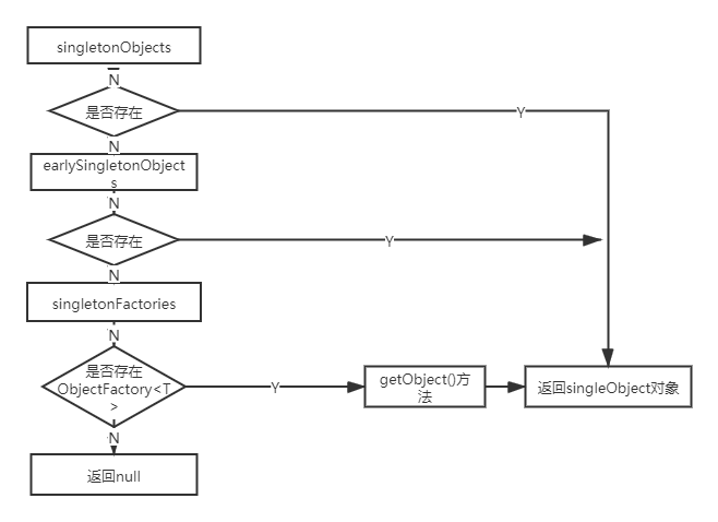 执行的逻辑大概是上面的过程。对singletonObject、earlySingletonObjects、singletonFactories逐级判断,其中singletonFactories中存储的是提前暴露的实例工厂,用来生成一个实例或者实例的代理类。