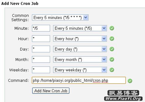 注:如果你的命令写的不对,你会在你的邮箱中收到类似 “/bin/sh: /home/www.piaoyi.org/public_html/cron.php: Permission denied”或者“No such file or directory”这样的错误提示;成功执行的话,邮箱中会收到类似“X-Powered-By: PHP/5.2.13 Content-type: text/html”这样的代码。