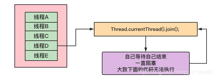 我们都知道 ,join方法的作用是阻塞,即等待线程结束,才继续执行。如果调用了Thread.currentThread().join(); 这个方法,那么线程一直在阻塞,无法终止。因为它自己在等待自己结束;这无疑会造成死锁;