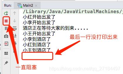 接下来我们来测试一把,代码和上面的一样,只需要改一行代码即可,在上面的代码的Hotel.run()方法中,将 t3.join(); 改为 Thread.currentThread().join(); 即可;