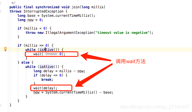 说了这么多,也举了这么多例子了,join方法是怎么实现线程等待的呢?我点进去join方法内部可以看到,其实它的内部也就是调用了wait()方法,