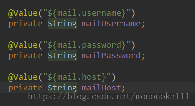 虽然没有编译和运行上的报错,经调试可知这种注解方式mailUsername、mailPassword、mailHost的值都是null,也就是说直接给静态变量读取配置文件是无效的,如下所示: