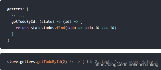 在组件中直接访问 this.$store.getters.getTodoById时,返回的是一个函数。然后再进行函数调用的方式传递参数进去,就得到了函数的结果。