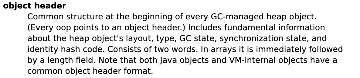 我们可以在Hotspot官方文档中找到它的描述(下图)。从中可以发现,它是Java对象和虚拟机内部对象都有的共同格式,由两个字(计算机术语)组成。另外,如果对象是一个Java数组,那在对象头中还必须有一块用于记录数组长度的数据,因为虚拟机可以通过普通Java对象的元数据信息确定Java对象的大小,但是从数组的元数据中无法确定数组的大小。