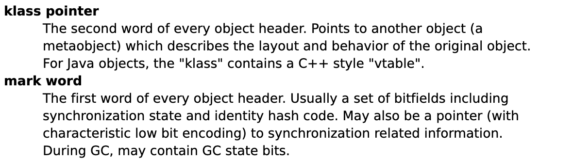它里面提到了对象头由两个字组成,这两个字是什么呢?我们还是在上面的那个Hotspot官方文档中往上看,可以发现还有另外两个名词的定义解释,分别是 mark word 和 klass pointer。