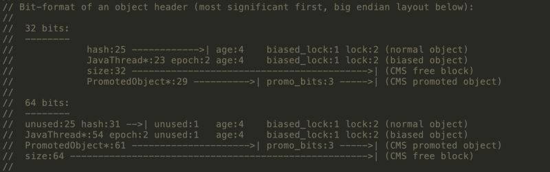 Mark Word在32位JVM中的长度是32bit,在64位JVM中长度是64bit。我们打开openjdk的源码包,对应路径/openjdk/hotspot/src/share/vm/oops,Mark Word对应到C++的代码markOop.hpp,可以从注释中看到它们的组成,本文所有代码是基于Jdk1.8。