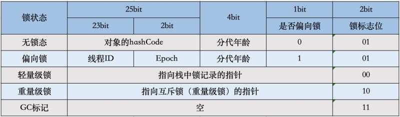 Mark Word在不同的锁状态下存储的内容不同,在32位JVM中是这么存的