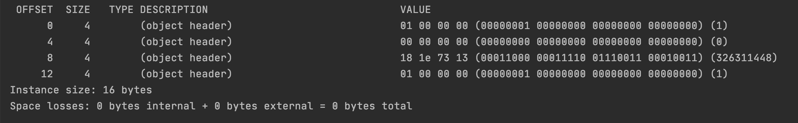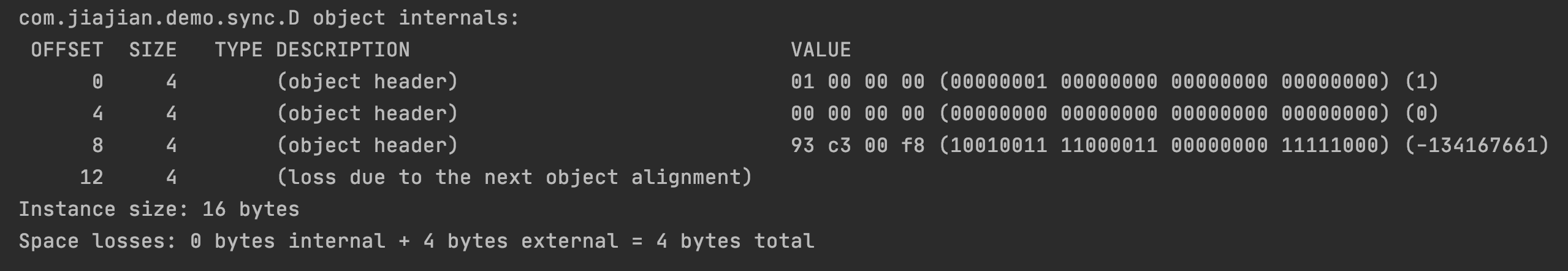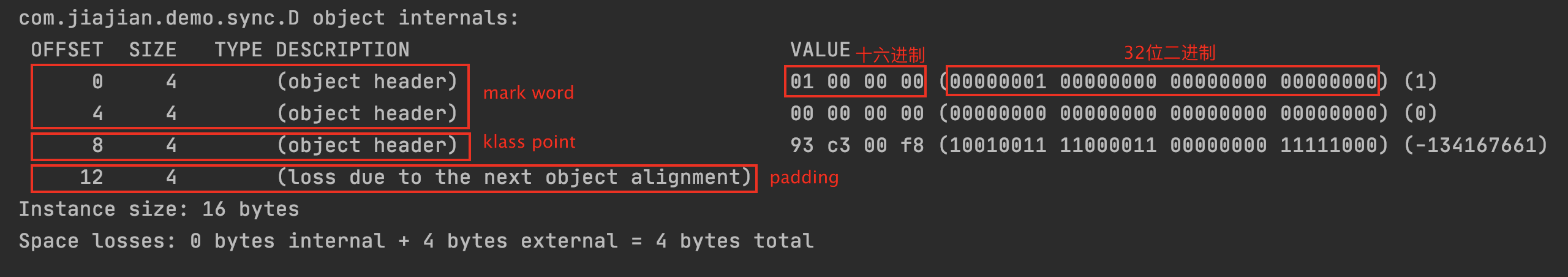 通过 jol-core 的 api,我们将对象的内部信息打印出来