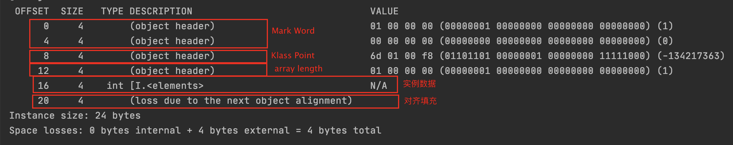 可以看到这时总SIZE为共24byte,对象头占16byte,其中Mark Work占8byte,Klass Point 占4byte,array length 占4byte,因为里面只有一个int 类型的1,所以数组对象的实例数据占据4byte,剩余对齐填充占据4byte。