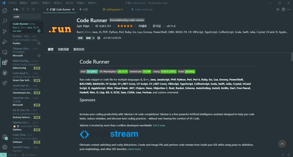 No such file or directory 意思是没有这样的文件或目录,fatal error: no input files 的意思是致命错误:没有输入文件,然后就编译已终止了。根据报错,我们发现 C++ 编译器是把 hello world.cpp 当成了 hello 和 world.cpp 两个文件,我的第一反应就是文件名带空格,要加上双引号。转到 Code Runner 插件页面,点击设置 -> 扩展设置。
