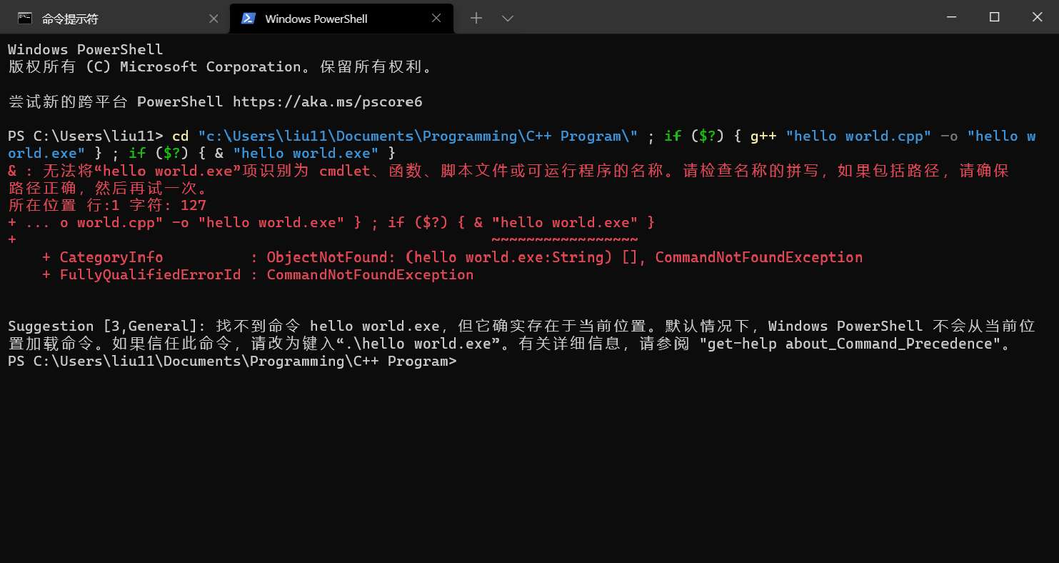 运行 hello world.cpp,这下编译成功了,但怎么输出文件名了?我又在 CMD 中测试了一下,是能编译通过并运行程序的,问题立马锁定在了 Powershell 上,我想,一定是 CMD 和 Powershell 运行程序的代码不同,所以才会出故障。