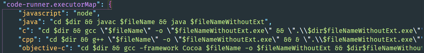 "cpp": "cd $dir && g++ \"$fileName\" -o \"$fileNameWithoutExt.exe\" && \"$fileNameWithoutExt.exe\"",
