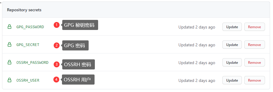 为了从Github Action发布,我们需要让Github Action可以使用我们的GPG私钥和OSSRH用户信息。为了保证这些敏感信息的安全性,我们可以使用Github Action Secrets来存储它们。