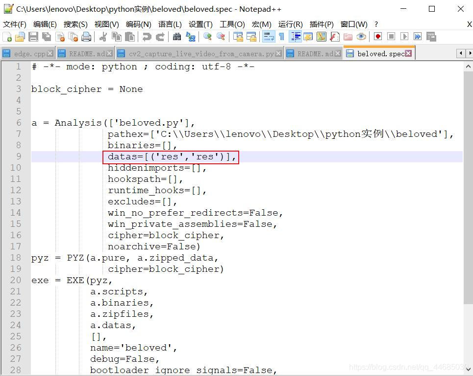 生成.spec文件。如果要添加Icon等可以在这里就使用pyi-makespec --icon abc.jpg -F beloved.py语句生成spec文件。