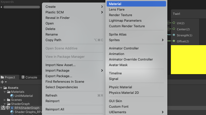在“PBRGraph”面板空白处 右键 --> 选择“Create Note” 创建Twirl(直接搜索名字即可)。