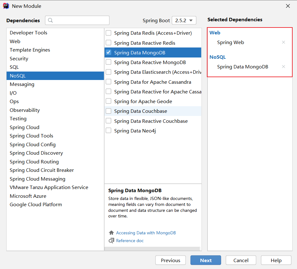 仅选择Spring Web、Spring Data MongoDB即可