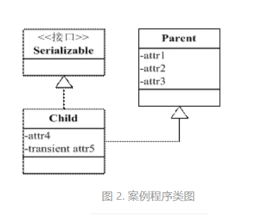 我们熟悉使用 Transient 关键字可以使得字段不被序列化,那么还有别的方法吗?根据父类对象序列化的规则,我们可以将不需要被序列化的字段抽取出来放到父类中,子类实现 Serializable 接口,父类不实现,根据父类序列化规则,父类的字段数据将不被序列化,形成类图如图 2 所示。