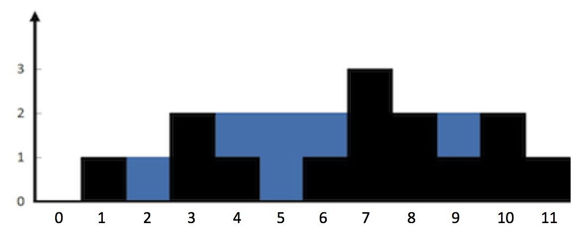 给了边界的高度(黑色部分),让求能装的水量(蓝色部分)。 为啥能用单调栈来做呢?我们先来考虑一下,什么情况下可以装下水呢,是不是必须两边高,中间低呢?我们对低洼的地方感兴趣,就可以使用一个单调递减栈,将递减的边界存进去,一旦发现当前的数字大于栈顶元素了,那么就有可能会有能装水的地方产生。此时我们当前的数字是右边界,我们从栈中至少需要有两个数字,才能形成一个坑槽,先取出的那个最小的数字,就是坑槽的最低点,再次取出的数字就是左边界,我们比较左右边界,取其中较小的值为装水的边界,然后此高度减去水槽最低点的高度,乘以左右边界间的距离就是装水量了。由于需要知道左右边界的位置,所以我们虽然维护的是递减栈,但是栈中数字并不是存递减的高度,而是递减的高度的坐标。这应该属于单调栈的高级应用了,可能并不是那么直接就能想出正确的解法。