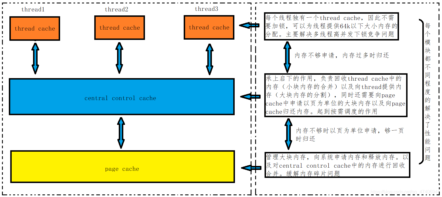 - 线程缓存(thread cache):每个线程独有线程缓存,主要解决多线程下高并发运行场景线程之间的锁竞争问题。线程缓存模块可以为线程提供小于64k内存的分配,并且多个线程并发运行不需要加锁。