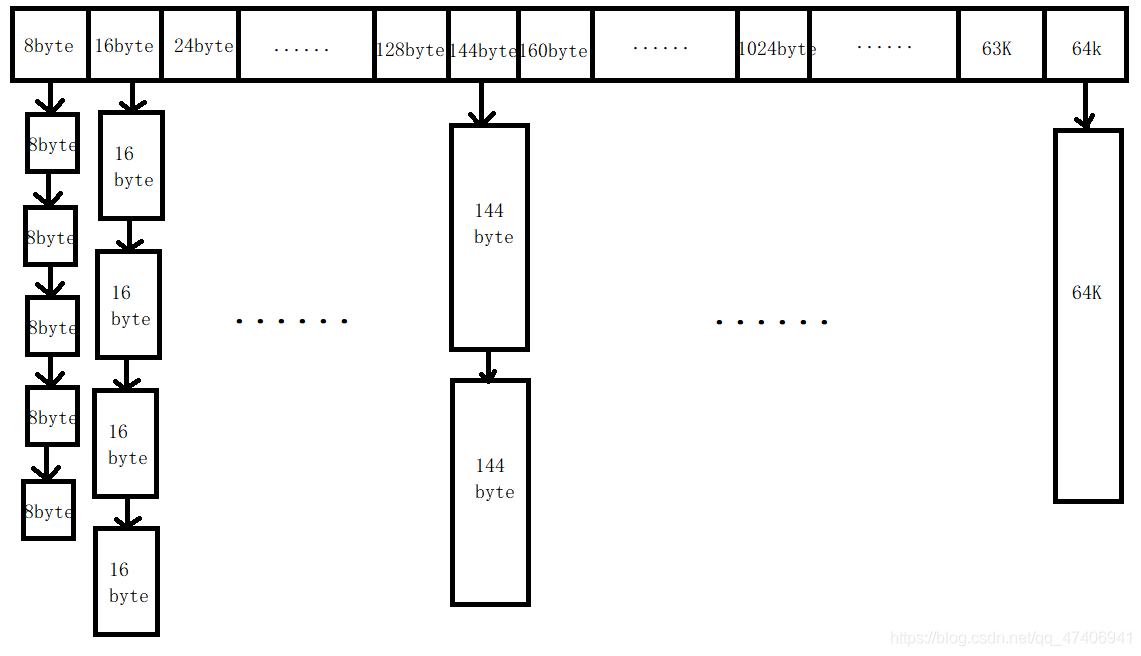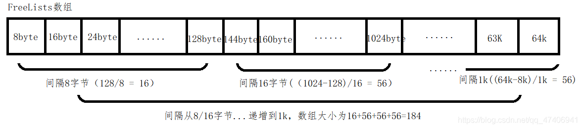 - 0~128采用8字节对齐,129~1024采用16字节对齐,1025~8*1024采用128字节对齐,8*1024~64*1024采用1024字节对齐;内存碎片浪费率分别为:1/8,129/136,1025/1032,8102/8199均在12%左右。同时,8字节对齐时需要[0,15]共16个哈希映射;16字节对齐需要[16,71]共56个哈希映射;128字节对齐需要[72,127]共56个哈希映射;1024字节对齐需要[128,184]共56个哈希映射。