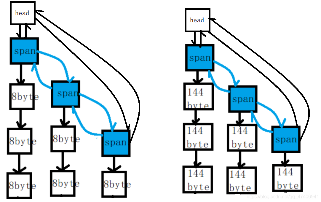 - span是用来管理一块内存的,它里边包含了一个freelist链表,用于将大块内存切割成指定大小的小块内存链接到freelist中,当thread cache需要内存时直接将切割好的内存给thread cache。