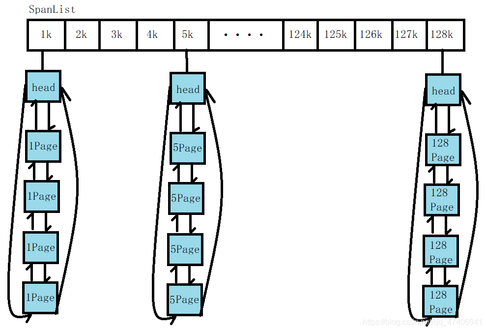 - 当central control cache向page cache申请内存时,比如要申请8页的内存,它会先在span大小为8的位置找,如果没有就继续找9 10...128,那个有就从那个中切割8页。