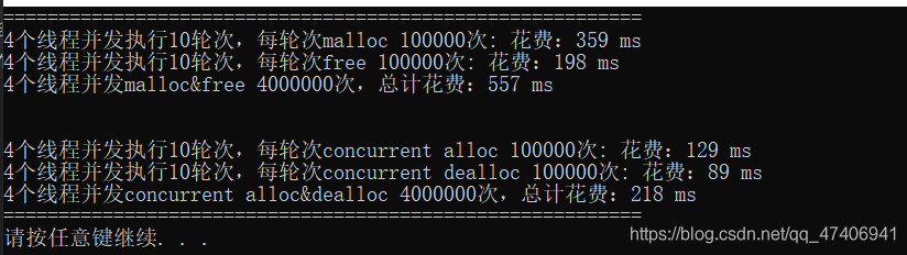 printf("%u个线程并发执行%u轮次,每轮次concurrent alloc %u次: 花费:%u ms\n",