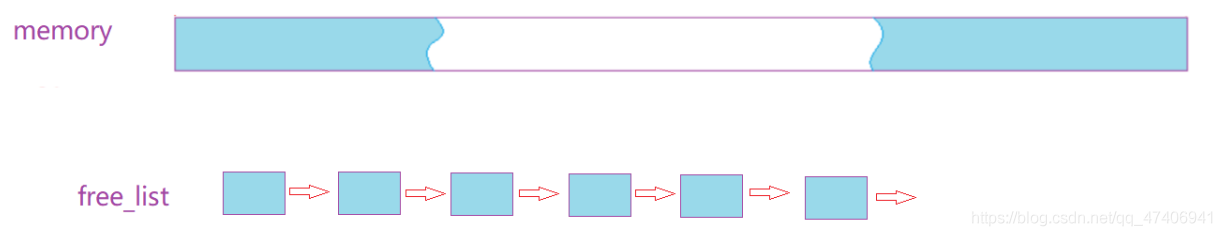 申请内存:加入要申请的内存大小为8字节直接在index = 0处分配一块内存,当然申请的内存小于8字节时也会直接分配8字节的内存。当Free_list[index]为nullptr时从内存中申请一块内存,切割成固定大小‘挂在'Free_list[index]位置。
