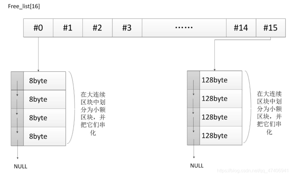 构造多个定长内存池,以一个固定的对齐数进行对齐(例如以8字节进行对齐),第一个定长内存池的内存对象大小为8(至少得能保证无论在64位还是32位系统下都可以保存下一个指针类型),第二个内存池对象大小为16...最后一个内存池对象大小为128byte,当申请的内存大小超过128字节时,通过二级空间配置器申请(直接从内存中申请)。