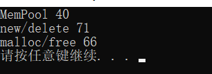 分别使用malloc/free、new/delete、memPool申请和释放110000个内存,时间如下: