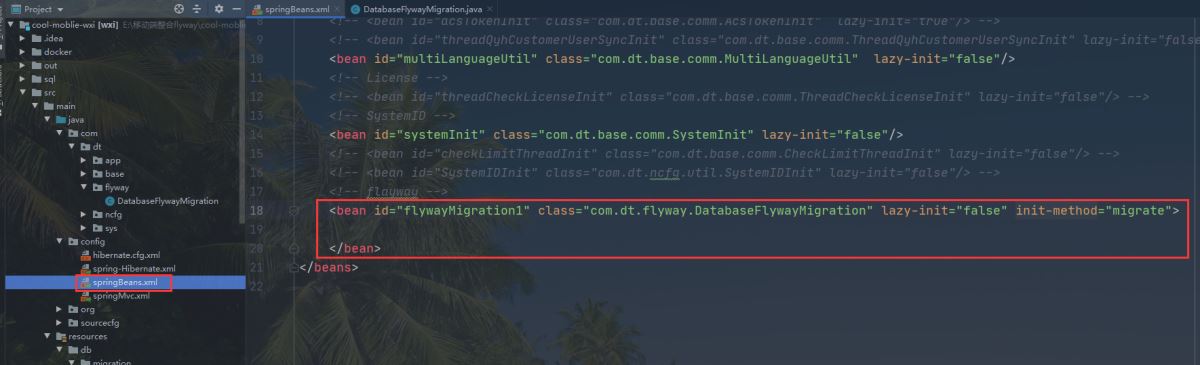 在spring的xml中注入flyway配置类的bean(每个spring项目都会带有一个xml文件,用来注册bean,复制的时候注意项目中DatabaseFlywayMigration所在的路径)