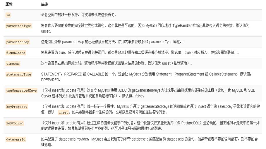 <insert id="insertAuthor" parameterType="domain.blog.Author" flushCache="true" statementType="PREPARED" keyProperty="" keyColumn="" useGeneratedKeys="" timeout="20"> <update id="updateAuthor" parameterType="domain.blog.Author" flushCache="true" statementType="PREPARED" timeout="20"> <delete id="deleteAuthor" parameterType="domain.blog.Author" flushCache="true" statementType="PREPARED" timeout="20">