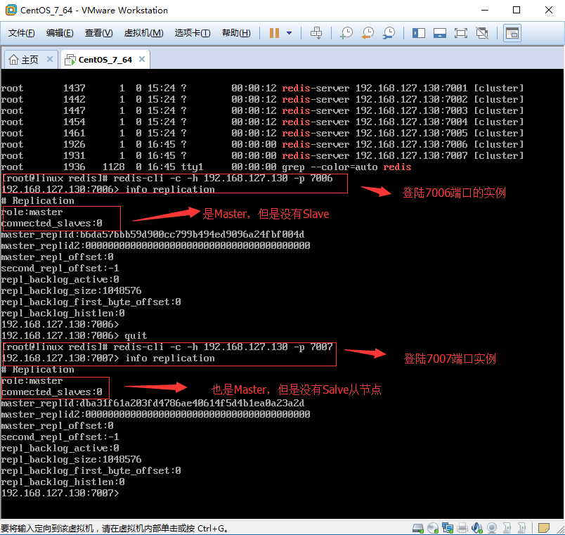 [root@linux redis]# pwd [root@linux redis]# /root/application/program/redis/ [root@linux redis]# redis-cli -c -h 192.168.127.130 -p 7007 //登陆7007 192.168.127.130::7007>cluster replicate 71ecd970838e9b400a2a6a15cd30a94ab96203bf(主节点的ID,这里是7006) 192.168.127.130::7007>OK