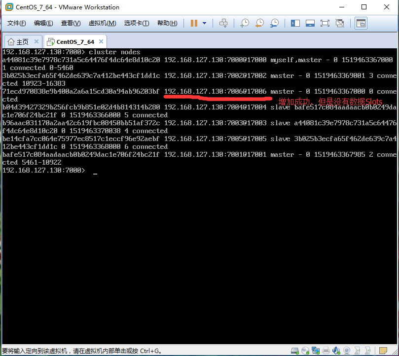 注意:当添加新节点成功以后,新的节点不会有任何数据,因为他没有分配任何的数据Slot(哈希slots),这一步需要手动操作。