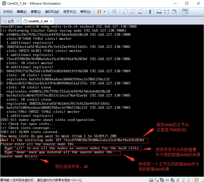 1.5、为7006Master主节点分配数据Slots,分配方法是从集群中知道任何一个主节点(因为只有Master主节点才有数据slots),然后对其进行重新分片工作。