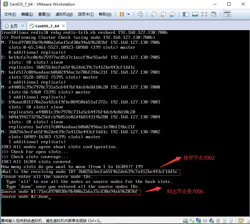 2.1.2、接受槽的Master主节点ID:这个节点可以是任意一个主节点都可以,我选择7002,ID是:3b025b3ecfa65f462de639c7a412be443cf1dd1c