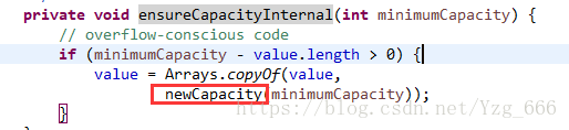确定下需要的最小的容量(已经存储的数据长度+准备存储的数据的长度)是否大于存储的char数组的长度,如果大于就在newCapacity扩容