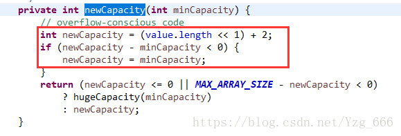 忽然又想到一个问题,那要是在追加字符串的时候长度比16大怎么办,我们看到有个ensureCapacityInternal()的方法,追进去看看,然后发现它是这么扩容的