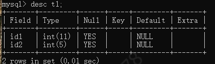 --创建表t1,有id1和id2两个字段,指定数值宽度分别为int和int(5) mysql> create table t1 (id1 int,id2 int(5)); mysql> desc t1;